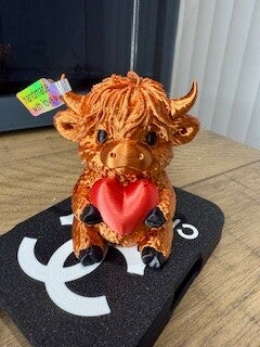3D printed Valentine’s Day Highland cow holding a heart